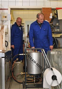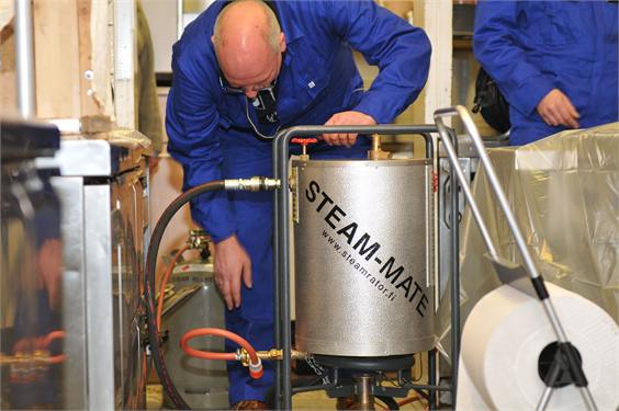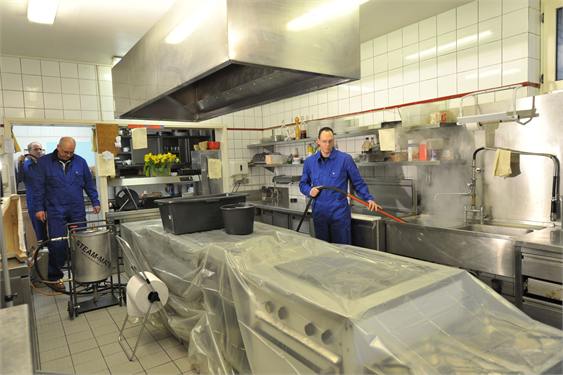 Mit dem Trockendampfverfahren können fettbelastete Kanäle auch an unzugänglichen Stellen gereinigt werden. Unsere Dampfgeneratoren erzeugen einen extrem trockenen Dampf mit einer Temperatur von ca. 200 Grad Celsius. Dieser Trockendampf wird in das abgeschottete Abluftsystem eingebracht. Je nach Kanaldurch-messer und Fettverschmutzung wird zwischen 20 und 60 Minuten bedampft. Sobald die Kanäle erhitzt werden, fangen die Fette an zu schmelzen und können durch den Ablaufstutzen aufgefangen werden.